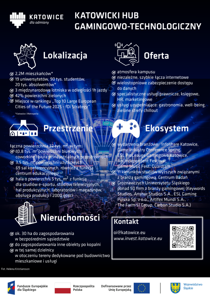 Projekt „Dzielnica Nowych Technologii – Katowicki Hub Gamingowo-Technologiczny” jest współfinansowany z Unii Europejskiej w ramach Funduszy Europejskich dla Śląskiego 2021-2027
